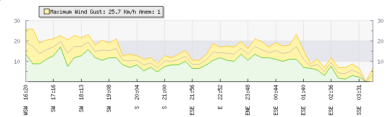 In the last few minutes the wind was East South East at an average speed of 5 kmh, reaching up to 7 kmh and a low of 3 kmh. The gust strength is4 kmh above the minimum speed |