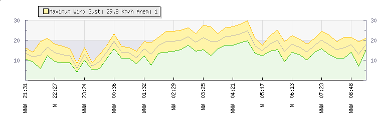 In the last few minutes the wind was Northerly at an average speed of 15 kmh, reaching up to 18 kmh and a low of 12 kmh. The gust strength is6 kmh above the minimum speed |