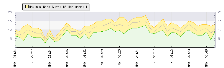 In the last few minutes the wind was Northerly at an average speed of 9 mph, reaching up to 11 mph and a low of 8 mph. The gust strength is3 mph above the minimum speed |