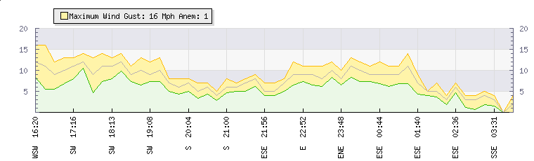 In the last few minutes the wind was East South East at an average speed of 3 mph, reaching up to 4 mph and a low of 2 mph. The gust strength is2 mph above the minimum speed |