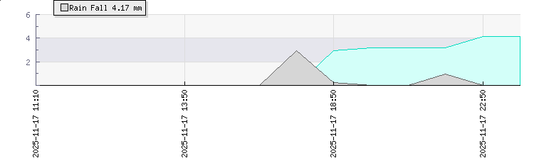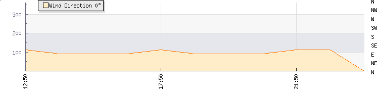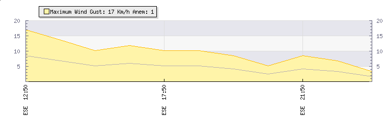 In the last few minutes the wind was East South East at an average speed of 4 kmh, reaching up to 9 kmh and a low of 0 kmh. The gust strength is9 kmh above the minimum speed |