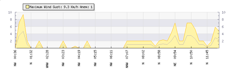 In the last few minutes the wind was North North East at an average speed of 3 kmh, reaching up to 5 kmh and a low of 0 kmh. The gust strength is5 kmh above the minimum speed |
