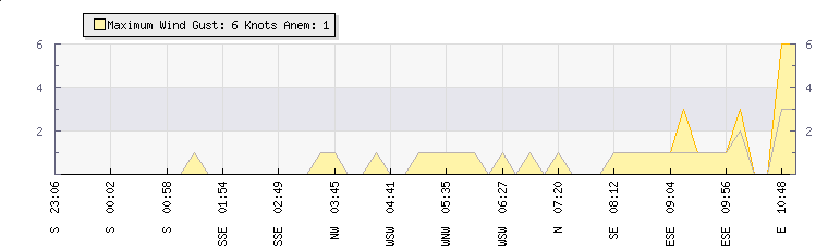 In the last few minutes the wind was East South East at an average speed of 1 knots, reaching up to 3 knots and a low of 0 knots. The gust strength is3 knots above the minimum speed |