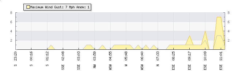 In the last few minutes the wind was East South East at an average speed of 1 mph, reaching up to 3 mph and a low of 0 mph. The gust strength is3 mph above the minimum speed |