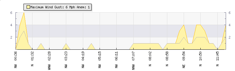 In the last few minutes the wind was North North East at an average speed of 2 mph, reaching up to 3 mph and a low of 0 mph. The gust strength is3 mph above the minimum speed |