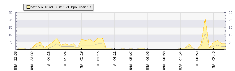 In the last few minutes the wind was West North West at an average speed of 2 mph, reaching up to 4 mph and a low of 0 mph. The gust strength is4 mph above the minimum speed |