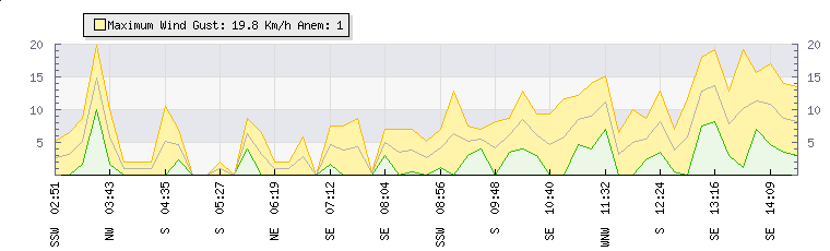 In the last few minutes the wind was West North West at an average speed of 13 kmh, reaching up to 18 kmh and a low of 8 kmh. The gust strength is10 kmh above the minimum speed |