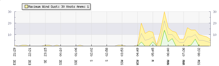 In the last few minutes the wind was West North West at an average speed of 11 knots, reaching up to 20 knots and a low of 3 knots. The gust strength is17 knots above the minimum speed |