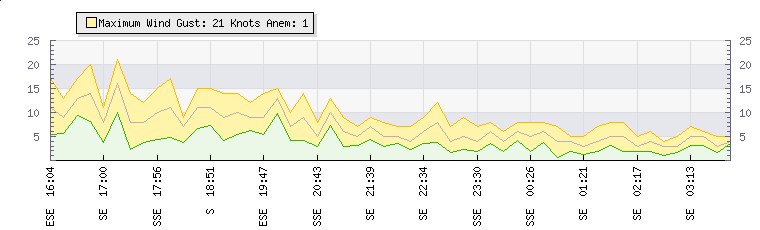 In the last few minutes the wind was South Easterly at an average speed of 3 knots, reaching up to 5 knots and a low of 2 knots. The gust strength is3 knots above the minimum speed |