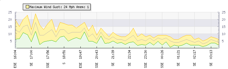 In the last few minutes the wind was South Easterly at an average speed of 4 mph, reaching up to 6 mph and a low of 2 mph. The gust strength is4 mph above the minimum speed |