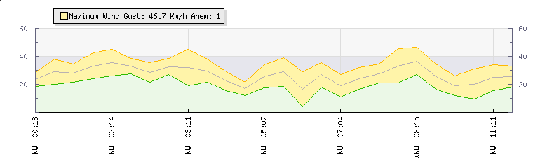 In the last few minutes the wind was West North West at an average speed of 28 kmh, reaching up to 34 kmh and a low of 21 kmh. The gust strength is13 kmh above the minimum speed |