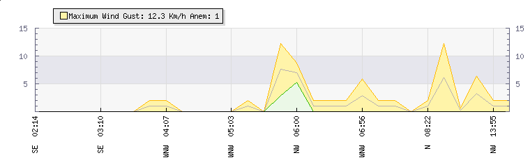 Weather Summary: In the last few minutes the wind was North Easterly at an average speed of 6 kmh, reaching up to 12 kmh and a low of 0 kmh. The gust strength is12 kmh above the minimum speed