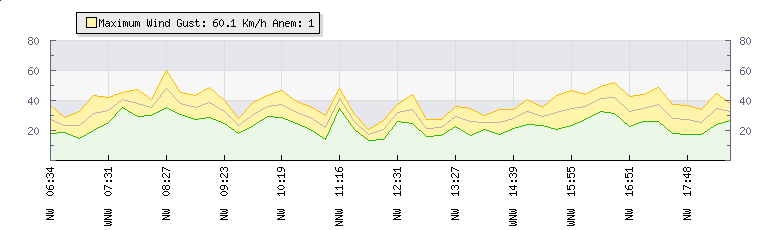 Weather Summary: In the last few minutes the wind was North Westerly at an average speed of 38 kmh, reaching up to 49 kmh and a low of 26 kmh. The gust strength is23 kmh above the minimum speed