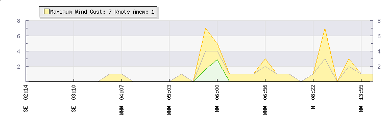In the last few minutes the wind was North Easterly at an average speed of 3 knots, reaching up to 7 knots and a low of 0 knots. The gust strength is7 knots above the minimum speed |
