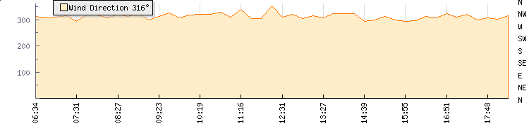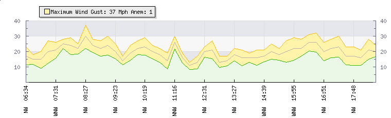 In the last few minutes the wind was North Westerly at an average speed of 23 mph, reaching up to 30 mph and a low of 16 mph. The gust strength is14 mph above the minimum speed |