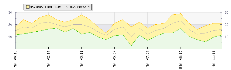 In the last few minutes the wind was West North West at an average speed of 17 mph, reaching up to 21 mph and a low of 13 mph. The gust strength is8 mph above the minimum speed |