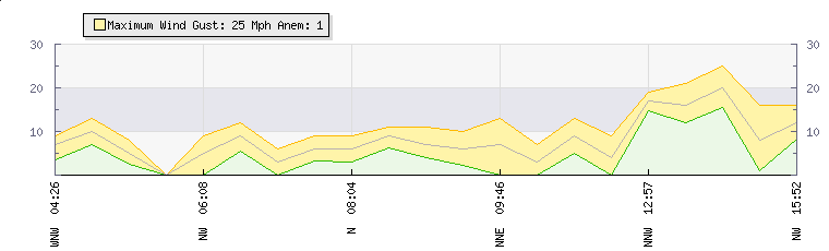 In the last few minutes the wind was East South East at an average speed of 3 mph, reaching up to 5 mph and a low of 0 mph. The gust strength is5 mph above the minimum speed |