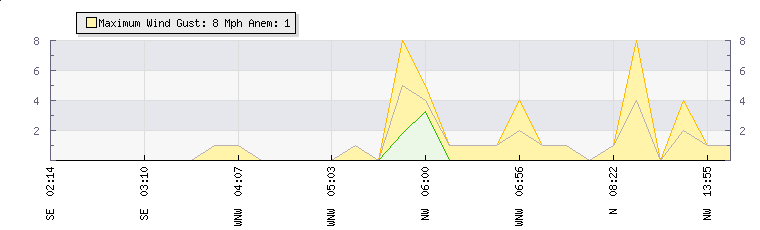In the last few minutes the wind was North Easterly at an average speed of 4 mph, reaching up to 8 mph and a low of 0 mph. The gust strength is8 mph above the minimum speed |