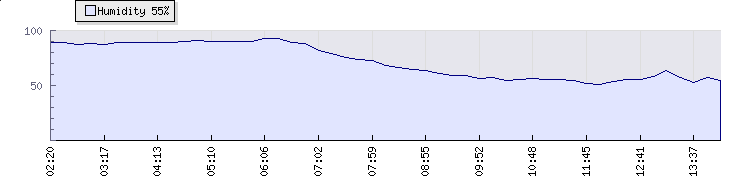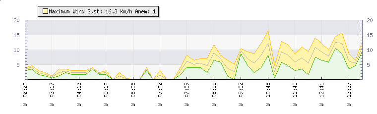 In the last few minutes the wind was Westerly at an average speed of 11 kmh, reaching up to 14 kmh and a low of 8 kmh. The gust strength is6 kmh above the minimum speed |