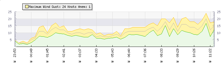 In the last few minutes the wind was Westerly at an average speed of 13 knots, reaching up to 16 knots and a low of 10 knots. The gust strength is6 knots above the minimum speed |