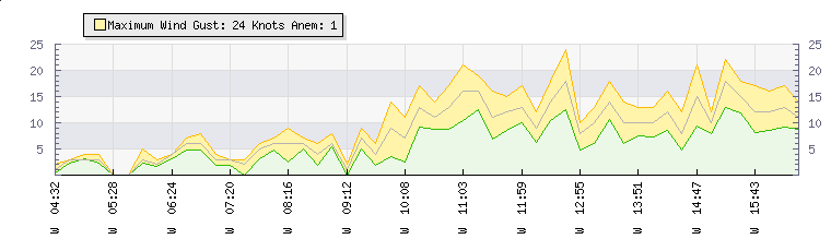 In the last few minutes the wind was Westerly at an average speed of 6 knots, reaching up to 8 knots and a low of 5 knots. The gust strength is3 knots above the minimum speed |