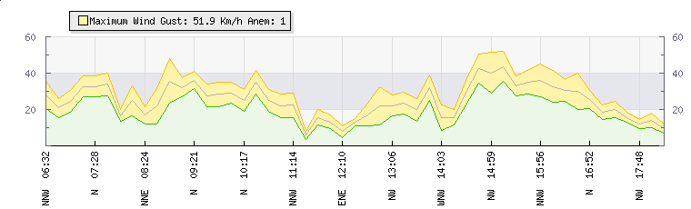 In the last few minutes the wind was Northerly at an average speed of 20 kmh, reaching up to 25 kmh and a low of 16 kmh. The gust strength is9 kmh above the minimum speed |