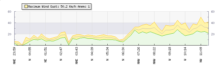 In the last few minutes the wind was West North West at an average speed of 29 kmh, reaching up to 37 kmh and a low of 22 kmh. The gust strength is15 kmh above the minimum speed |