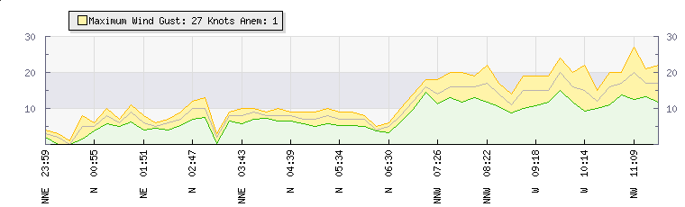In the last few minutes the wind was West North West at an average speed of 16 knots, reaching up to 20 knots and a low of 12 knots. The gust strength is8 knots above the minimum speed |