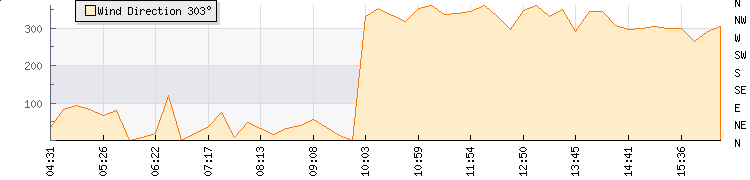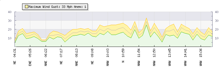 In the last few minutes the wind was East North East at an average speed of 11 mph, reaching up to 14 mph and a low of 7 mph. The gust strength is7 mph above the minimum speed |