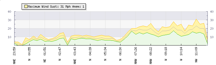 In the last few minutes the wind was North Westerly at an average speed of 18 mph, reaching up to 22 mph and a low of 15 mph. The gust strength is7 mph above the minimum speed |