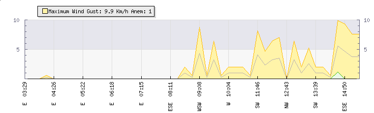 In the last few minutes the wind was South Westerly at an average speed of 1 kmh, reaching up to 2 kmh and a low of 0 kmh. The gust strength is2 kmh above the minimum speed |