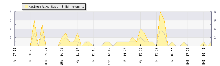 In the last few minutes the wind was North North East at an average speed of 0 mph, reaching up to 0 mph and a low of 0 mph. The gust strength is0 mph above the minimum speed |