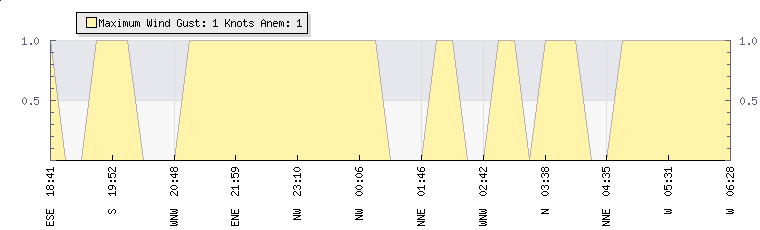 In the last few minutes the wind was Westerly at an average speed of 1 knots, reaching up to 1 knots and a low of 0 knots. The gust strength is1 knots above the minimum speed |