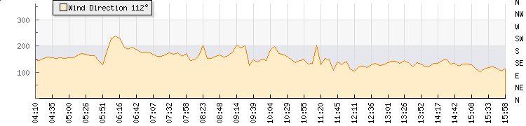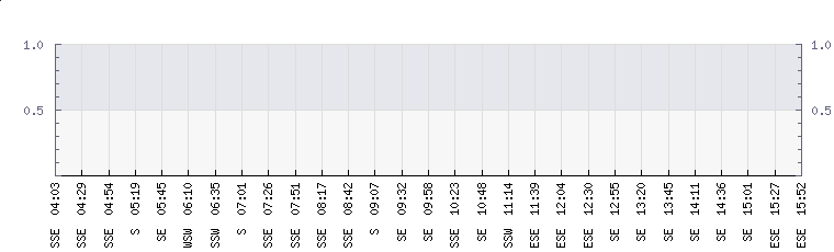 In the last few minutes the wind was South Easterly at an average speed of 0 kmh, reaching up to 0 kmh and a low of 0 kmh. The gust strength is0 kmh above the minimum speed |