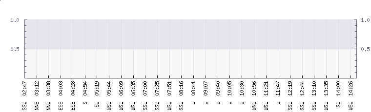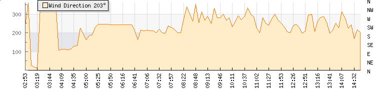 In the last few minutes the wind was West North West at an average speed of 0 kmh, reaching up to 0 kmh and a low of 0 kmh. The gust strength is0 kmh above the minimum speed |