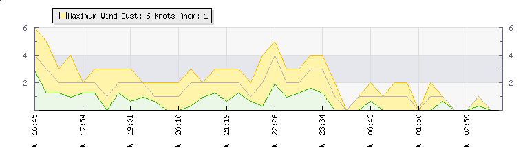 In the last few minutes the wind was Westerly at an average speed of 1 knots, reaching up to 1 knots and a low of 0 knots. The gust strength is1 knots above the minimum speed |