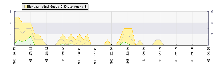 In the last few minutes the wind was North Easterly at an average speed of 0 knots, reaching up to 0 knots and a low of 0 knots. The gust strength is0 knots above the minimum speed |