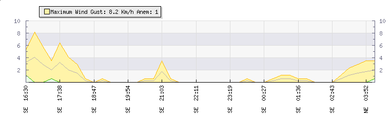 Weather Summary: In the last few minutes the wind was South Easterly at an average speed of 1 kmh, reaching up to 1 kmh and a low of 0 kmh. The gust strength is1 kmh above the minimum speed
