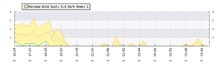 In the last few minutes the wind was Southerly at an average speed of 0 kmh, reaching up to 0 kmh and a low of 0 kmh. The gust strength is0 kmh above the minimum speed |