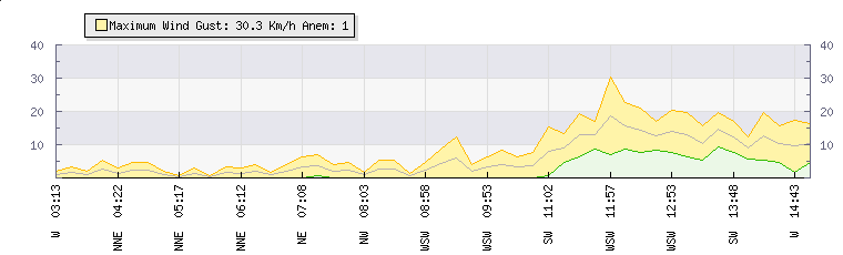 In the last few minutes the wind was Westerly at an average speed of 11 kmh, reaching up to 16 kmh and a low of 5 kmh. The gust strength is11 kmh above the minimum speed |