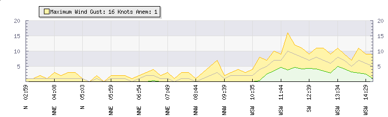 In the last few minutes the wind was Westerly at an average speed of 6 knots, reaching up to 9 knots and a low of 3 knots. The gust strength is6 knots above the minimum speed |
