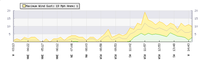 In the last few minutes the wind was Westerly at an average speed of 7 mph, reaching up to 10 mph and a low of 3 mph. The gust strength is7 mph above the minimum speed |