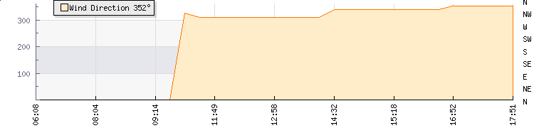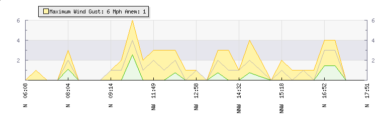 In the last few minutes the wind was North North West at an average speed of 1 mph, reaching up to 1 mph and a low of 0 mph. The gust strength is1 mph above the minimum speed |