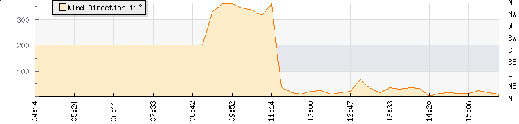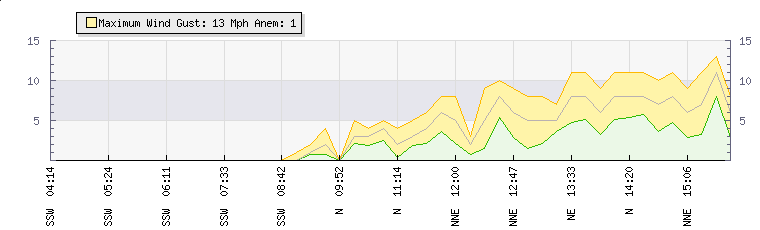 In the last few minutes the wind was North North East at an average speed of 6 mph, reaching up to 9 mph and a low of 3 mph. The gust strength is6 mph above the minimum speed |