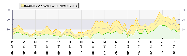 In the last few minutes the wind was Southerly at an average speed of 13 kmh, reaching up to 16 kmh and a low of 9 kmh. The gust strength is7 kmh above the minimum speed |