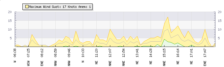In the last few minutes the wind was East North East at an average speed of 2 knots, reaching up to 3 knots and a low of 0 knots. The gust strength is3 knots above the minimum speed |