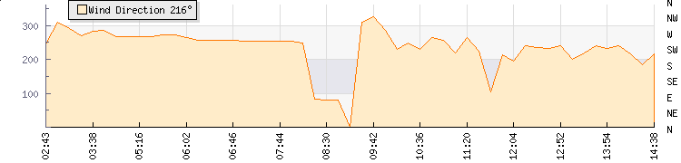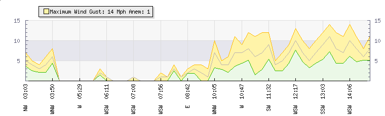 In the last few minutes the wind was South Westerly at an average speed of 11 mph, reaching up to 14 mph and a low of 7 mph. The gust strength is7 mph above the minimum speed |
