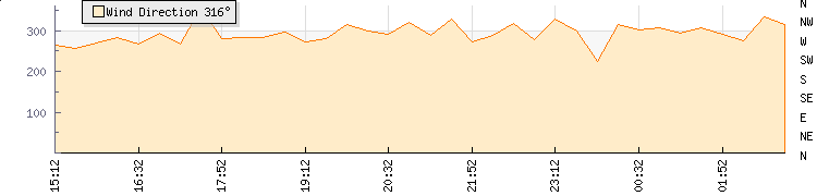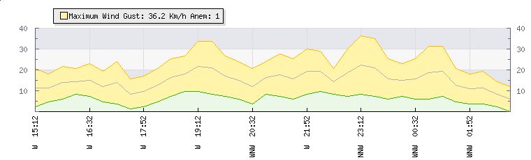 In the last few minutes the wind was Westerly at an average speed of 14 kmh, reaching up to 24 kmh and a low of 4 kmh. The gust strength is20 kmh above the minimum speed |