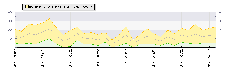 In the last few minutes the wind was North North West at an average speed of 14 kmh, reaching up to 23 kmh and a low of 5 kmh. The gust strength is18 kmh above the minimum speed |