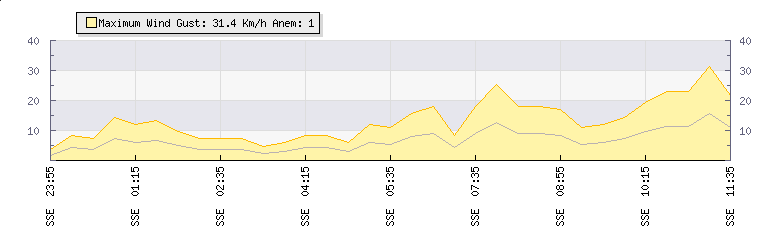 In the last few minutes the wind was South South East at an average speed of 7 kmh, reaching up to 14 kmh and a low of 0 kmh. The gust strength is14 kmh above the minimum speed |